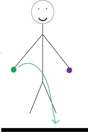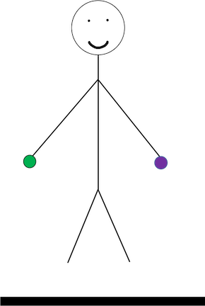 The next ball to throw is the red one. Note that this is similar to how we started, but the red ball is in the LH instead of the RH. To keep juggling, simply continue throwing from the opposite hand as soon as one ball hits the ground. The balls will always be thrown in the same order: red-purple-green, red-purple-green, etc. Notice that only one ball is moving towards the ground at any point. There should never be two balls in one hand besides when you start or end the pattern.